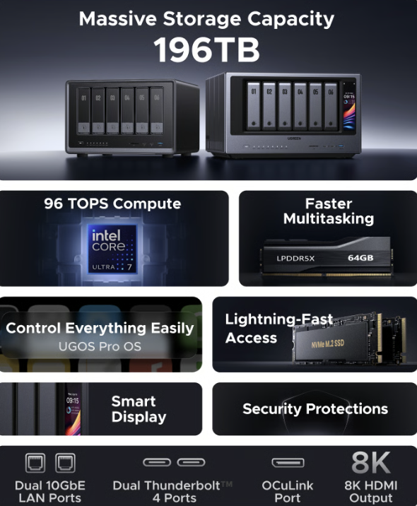 구입하신 UGREEN AI NAS에는 OCuLink 단자와 Thunderbolt 4 단자가 모두 있습니다.
